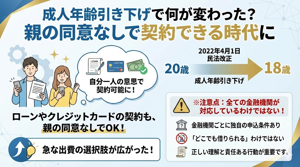 これまでは、18歳・19歳の方がローンを組むには親権者の同意が必須でした。しかし法改正後は、親の同意なしでローン契約を締結することが可能になったのです。これは、急な出費でお金が必要になった若者にとって、選択肢が広がったことを意味します。