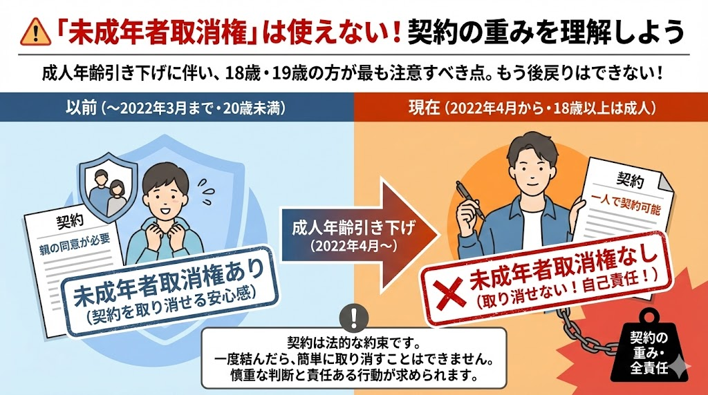 しかし、18歳・19歳は「成人」と見なされるため、この権利の対象外となります。つまり、一度自分の意思で結んだ契約は、たとえ後で不利な内容だと気づいても、簡単には取り消せなくなったのです。