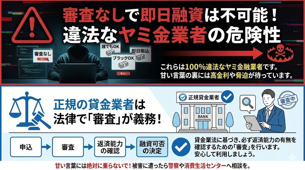インターネットやSNSで「審査なしで即日融資」「誰でもOK」といった甘い言葉を見かけることがありますが、これらは100%違法なヤミ金融業者です。正規の貸金業者は、貸金業法に基づき、必ず返済能力の有無を確認するための「審査」を行うことが義務付けられています。