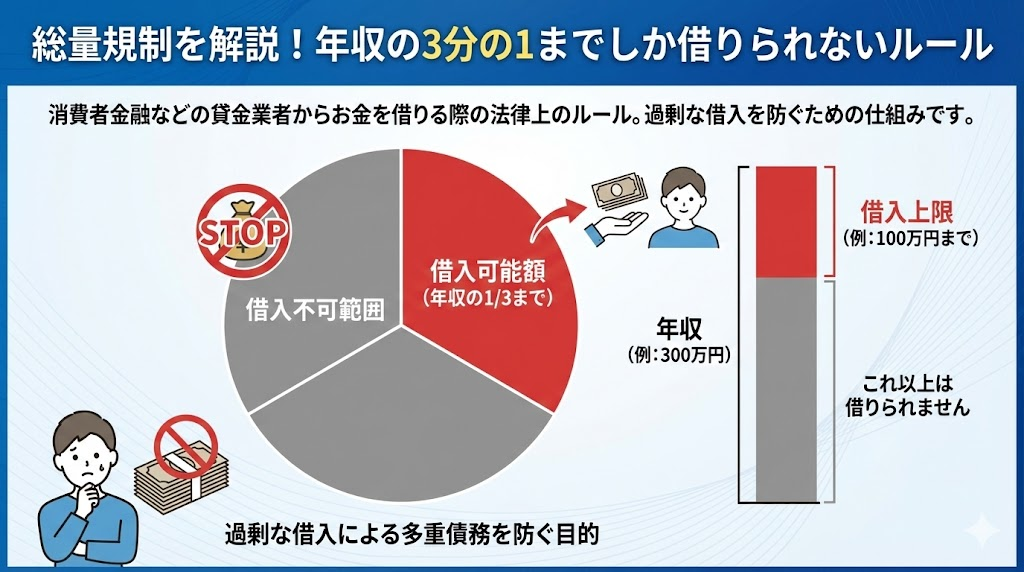 貸金業者からの借入残高が、年収の3分の1を超えてはならないというルールです。例えば、年収が90万円の場合、借りられる上限額は合計で30万円までとなります。これは1社からだけでなく、複数の貸金業者からの借入合計額で計算されます。(参照:日本貸金業協会