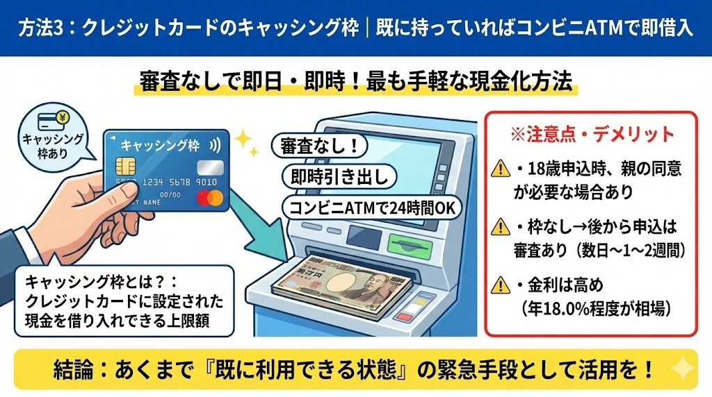 • 方法3:クレジットカードのキャッシング枠|既に持っていればコンビニATMで即借入