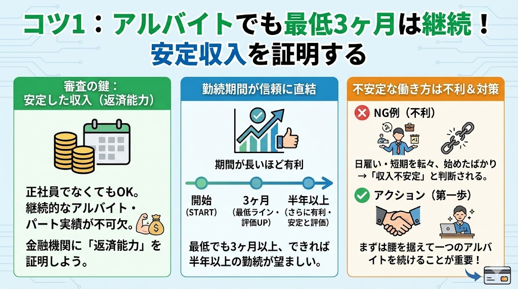 重要なのは「継続性」です。始めたばかりのアルバイトや、日雇い・単発の仕事で収入が不安定な場合は、審査で不利になる可能性が高いです。金融機関によって基準は異なりますが、一般的には最低でも3ヶ月〜6ヶ月以上、同じ勤務先で継続して働いていることが目安とされています。