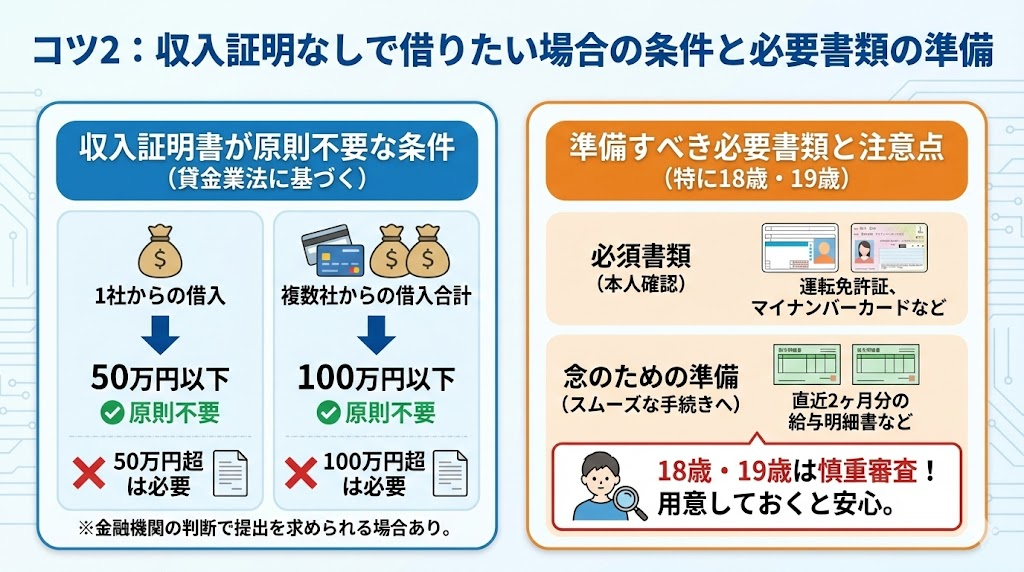 消費者金融などの貸金業者から借りる場合、希望する借入額が50万円以下で、かつ他社からの借入合計額と合わせても100万円以下であれば、法律上は収入証明書の提出義務はありません。そのため、少額の借り入れであれば収入証明書なしで申し込める可能性が高いです。