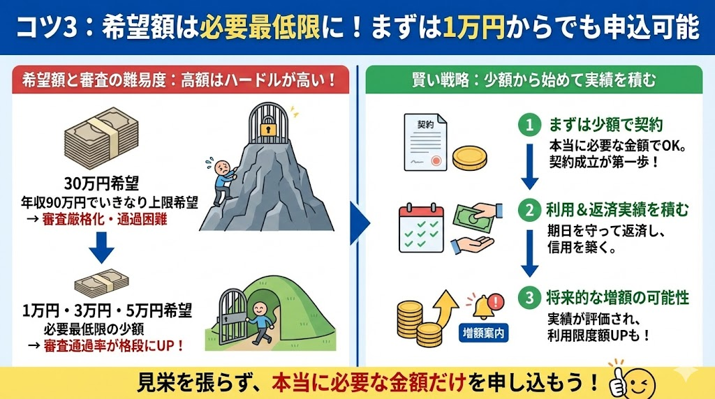 18歳・19歳の方の場合、アルバイト収入が主な収入源となることが多いため、年収はそれほど高くないケースがほとんどです。そのため、借りられる金額も自ずと限られてきます。申込時には、自分の年収を正確に把握し、総量規制の範囲内で希望額を設定することが重要です。