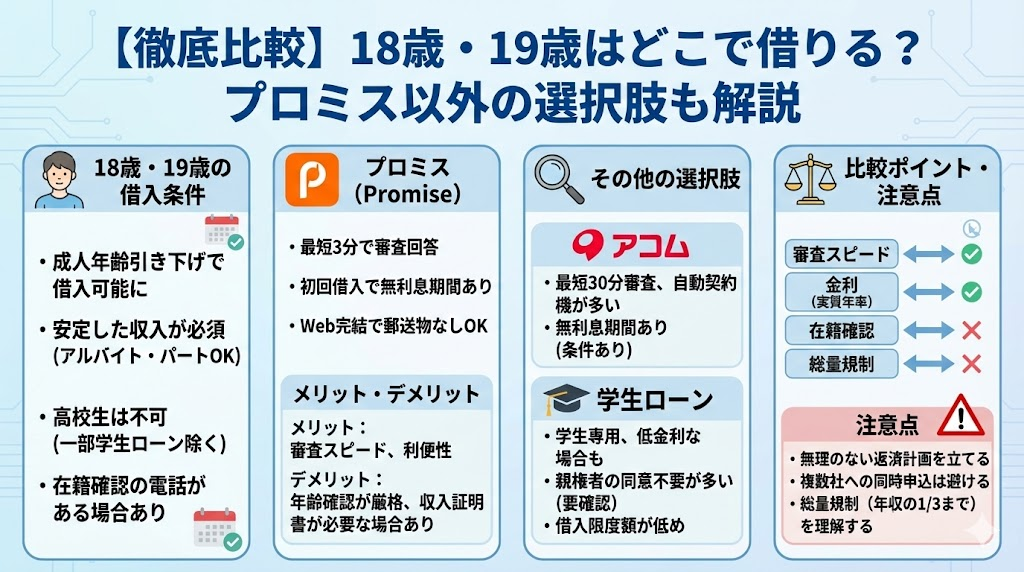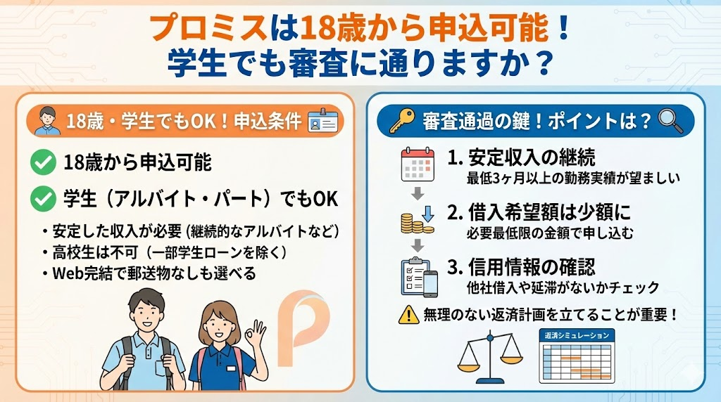 現状、大手消費者金融の中で18歳・19歳からの申し込みに明確に対応しているのは「プロミス」です。公式サイトでも「18歳から申込可能」と明記されています(※高校生は除く)。