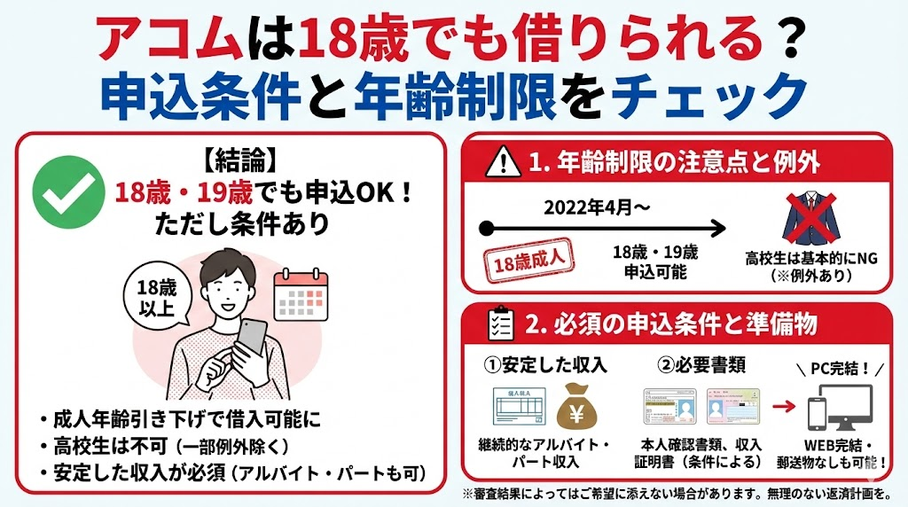 アコムの公式サイトに明記されている通り、申込条件は「20歳以上」となっています。これは法律上の成人年齢とは別に、アコムが独自に設定している基準です。したがって、19歳の方はアコムに申し込む資格がありません。20歳の誕生日を迎えてから、改めて申し込みを検討してください。