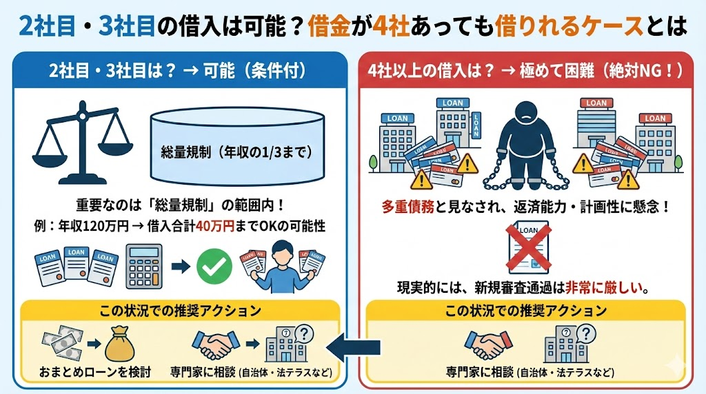 現実的には、4社以上の借り入れがあると、新規で審査に通るのは極めて困難と言わざるを得ません。この状況でさらに借金を重ねるのではなく、おまとめローンを検討したり、専門家(自治体の相談窓口や法テラスなど)に相談したりすることを強く推奨します。