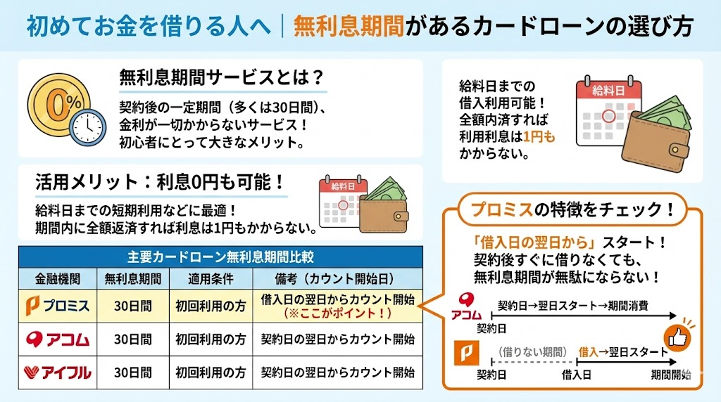 プロミスは「借入日の翌日から」無利息期間がスタートするため、契約後すぐに借りない場合でも無駄がありません。初めての方は、こうした無利息サービスのあるカードローンを選ぶのがおすすめです。