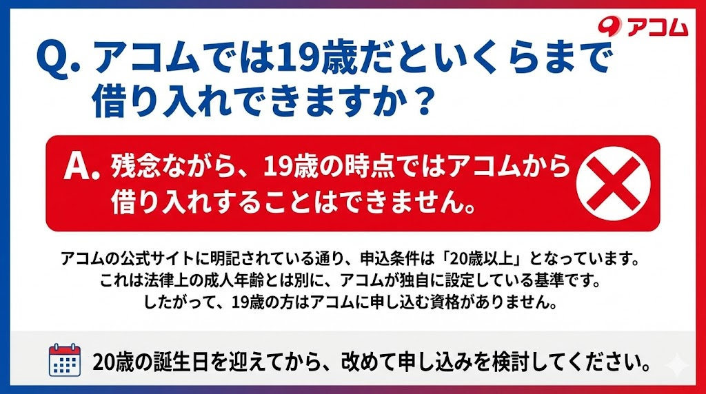 A. 残念ながら、19歳の時点ではアコムから借り入れすることはできません。