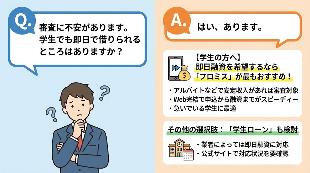 Q. 審査に不安があります。学生でも即日で借りられるところはありますか?