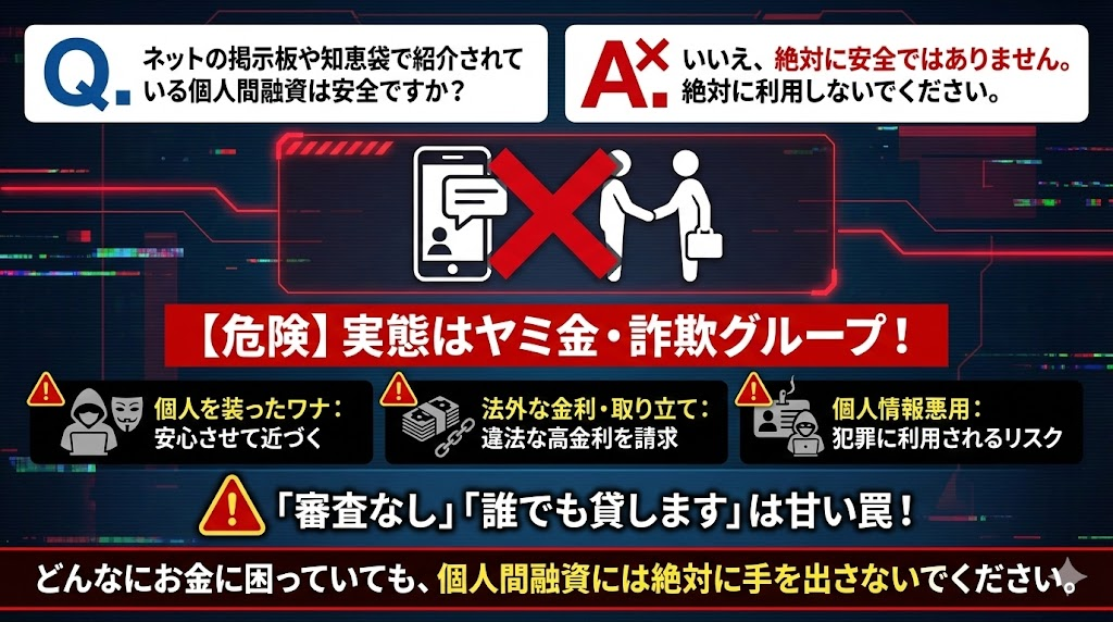 • Q. ネットの掲示板や知恵袋で紹介されている個人間融資は安全ですか?