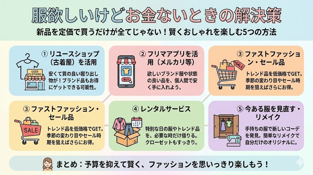 服が欲しいのにお金がないとき、まず考えたいのは「いかに安く、質の良い服を手に入れるか」という点です。新品の服を定価で買うことだけがファッションを楽しむ方法ではありません。ここでは、予算を抑えながらも満足のいく服を手に入れるための、具体的な5つの方法をご紹介します。