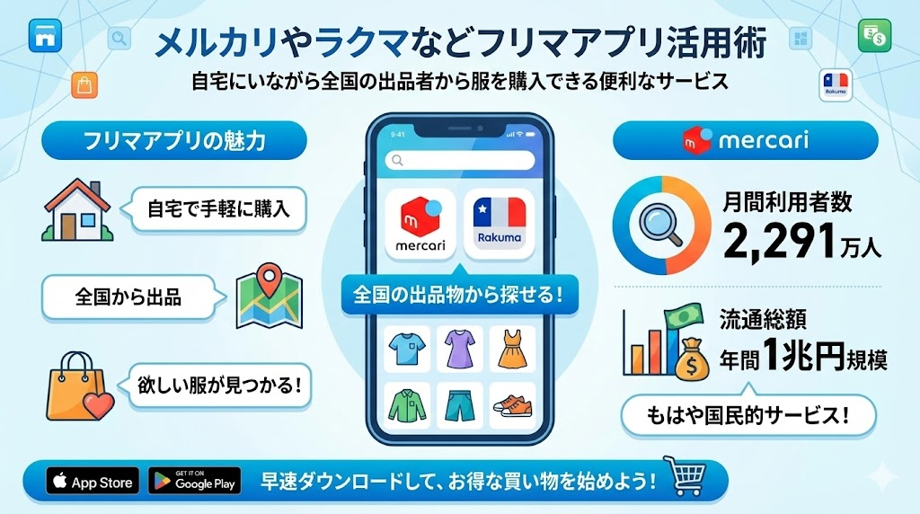 フリマアプリは、自宅にいながら全国の出品者から服を購入できる便利なサービスです。メルカリの月間利用者数は2,291万人、流通総額は年間1兆円規模に達しており、もはや国民的なサービスとなっています。