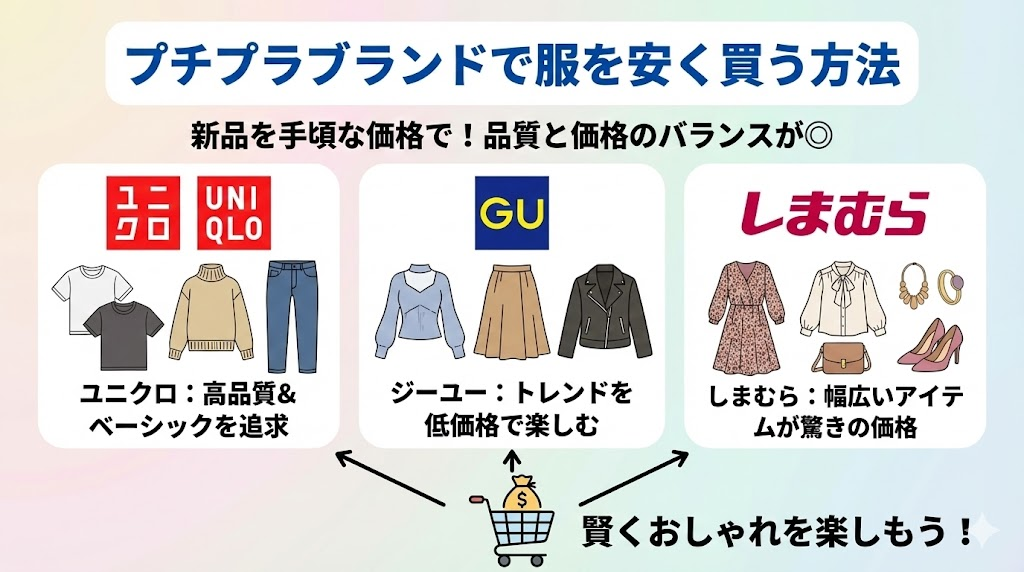 プチプラブランドは、新品の服を手頃な価格で購入できる貴重な選択肢です。特にユニクロ、GU、しまむらの3大ブランドは、品質と価格のバランスが良く、多くの人に支持されています。