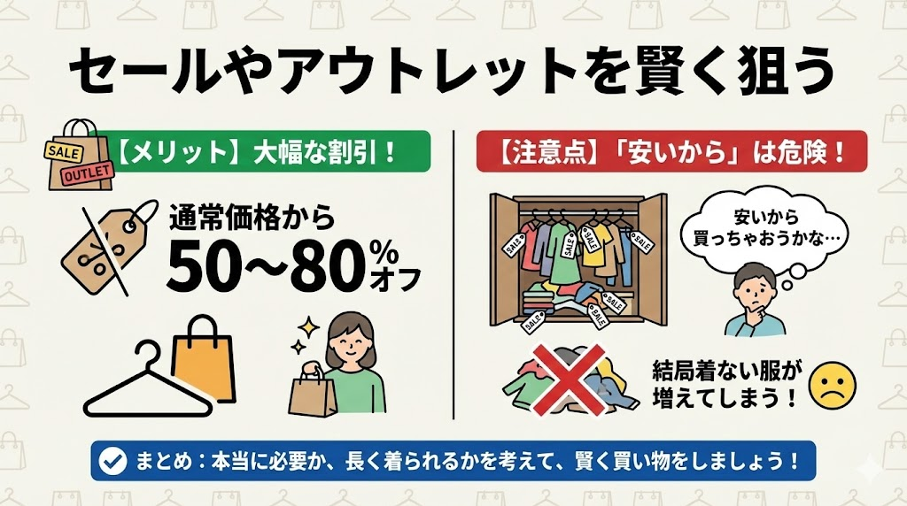 セールやアウトレットを活用すれば、通常価格の50〜80%オフで服を購入することができます。ただし、「安いから」という理由だけで購入すると、結局着ない服が増えてしまうので注意が必要です。