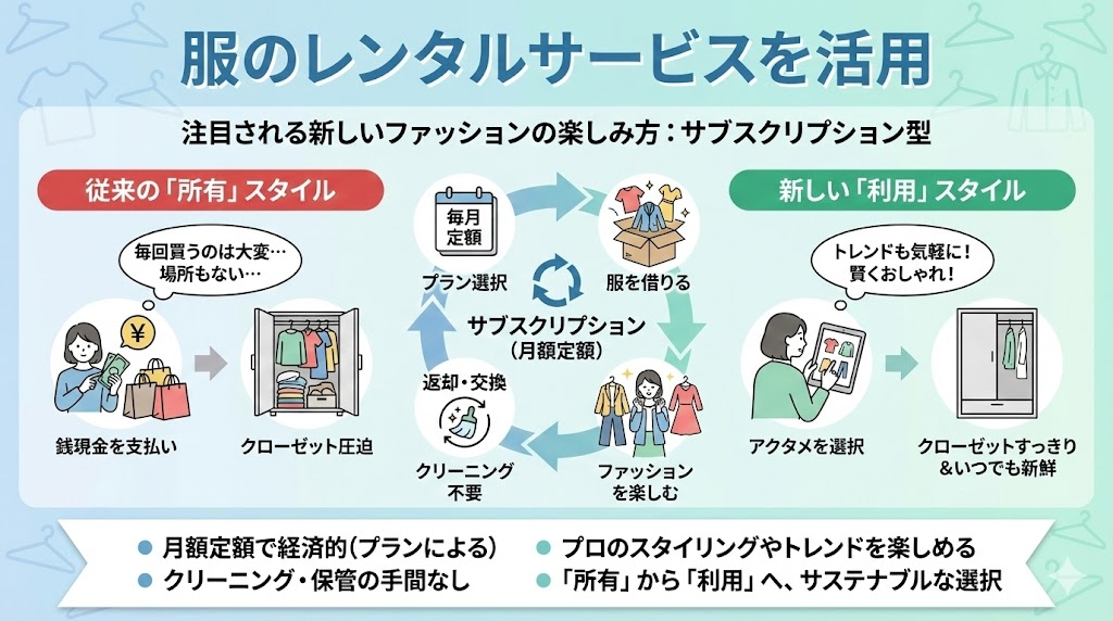 最近注目を集めているのが、服のサブスクリプション型レンタルサービスです。毎月定額で服を借りられるため、「所有」ではなく「利用」という新しいファッションの楽しみ方ができます。