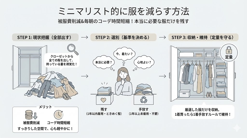 服を減らすことは、被服費の削減だけでなく、毎朝のコーディネートに悩む時間も減らせるというメリットがあります。ミニマリストの考え方を取り入れて、本当に必要な服だけを残しましょう。