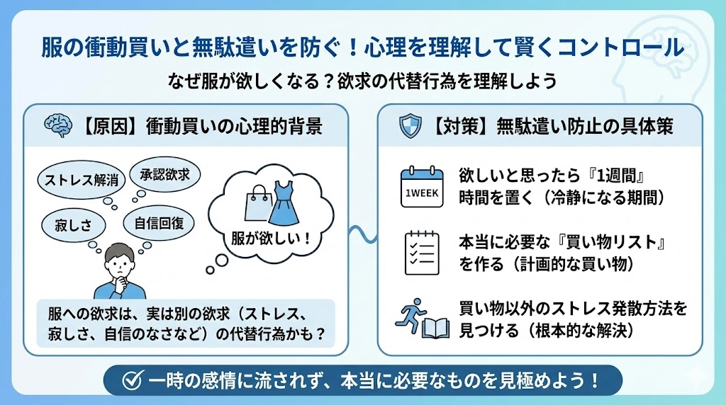 服の衝動買いを防ぐには、「なぜ服が欲しくなるのか」という心理を理解することが重要です。多くの場合、服への欲求は別の欲求の代替行為である可能性があります。