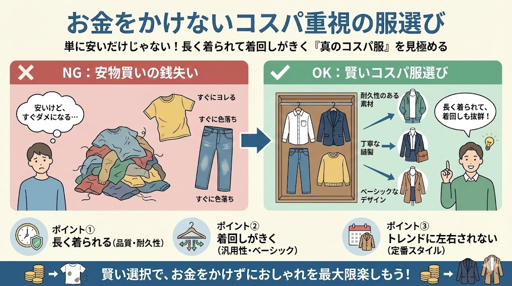 お金をかけずにおしゃれを楽しむためには、「コスパの良い服」を見極める力が必要です。単に安いだけではなく、長く着られて、着回しがきく服を選ぶことが重要です。