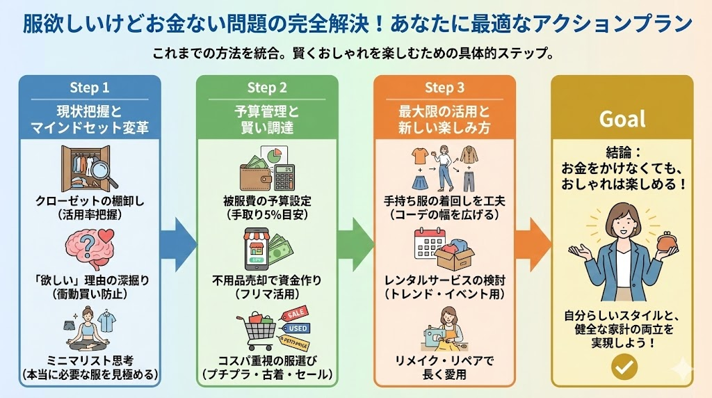 ここまで、服が欲しいけどお金がないという悩みを解決するための様々な方法をご紹介してきました。最後に、これらの方法を統合して、あなたに最適な解決策を見つけるためのアクションプランをまとめます。