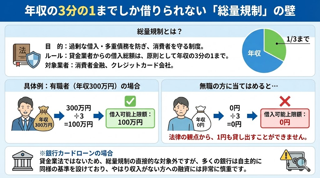 このルールを無職の方に当てはめて考えると、年収が0円ということになります。そのため、年収の3分の1も0円となり、法律の観点から貸金業者は1円も貸し出すことができないのです。なお、銀行からのカードローンは貸金業法ではないため総量規制の直接的な対象外ですが、多くの銀行は自主的に同様の基準を設けており、やはり収入がない方への融資には非常に慎重です。