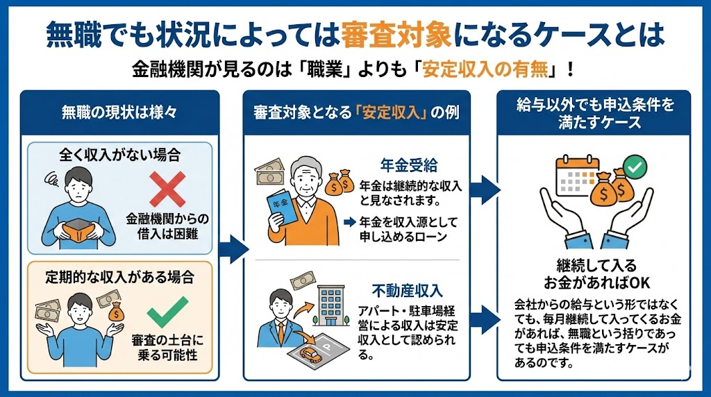 「無職」と一言で言っても、その状況は様々です。全く収入がない場合は金融機関からの借入は困難ですが、会社に勤めていなくても定期的な収入があれば、審査の土台に乗る可能性があります。金融機関が見ているのは「職業」そのものよりも「安定収入の有無」だからです。