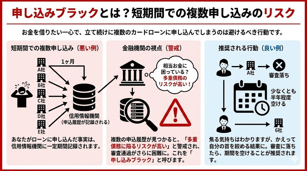 お金を借りたい一心で、立て続けに複数のカードローンに申し込んでしまうのは避けるべき行動です。短期間に複数の申し込みを行うと、「申し込みブラック」と呼ばれる状態になり、審査に通過することがさらに難しくなる可能性があります。