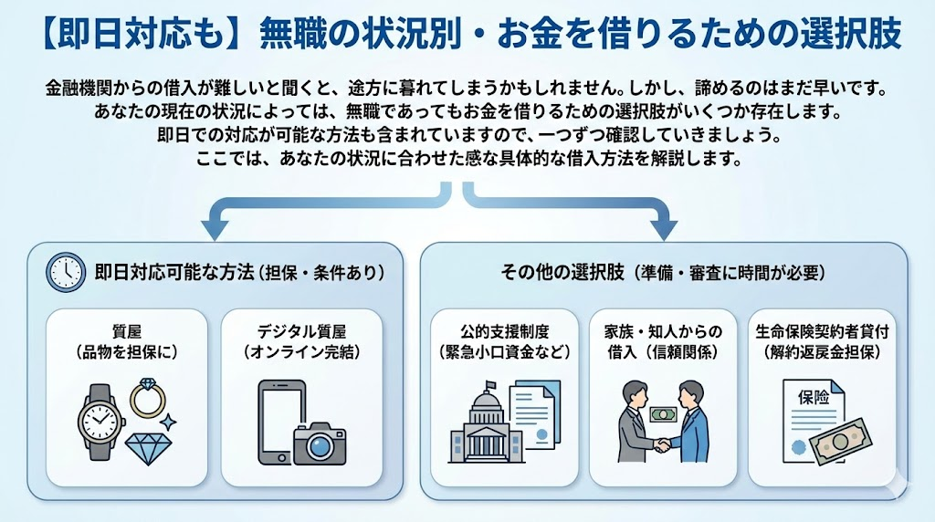 金融機関からの借入が難しいと聞くと、途方に暮れてしまうかもしれません。しかし、諦めるのはまだ早いです。あなたの現在の状況によっては、無職であってもお金を借りるための選択肢がいくつか存在します。即日での対応が可能な方法も含まれていますので、一つずつ確認していきましょう。ここでは、あなたの状況に合わせた具体的な借入方法を解説します。