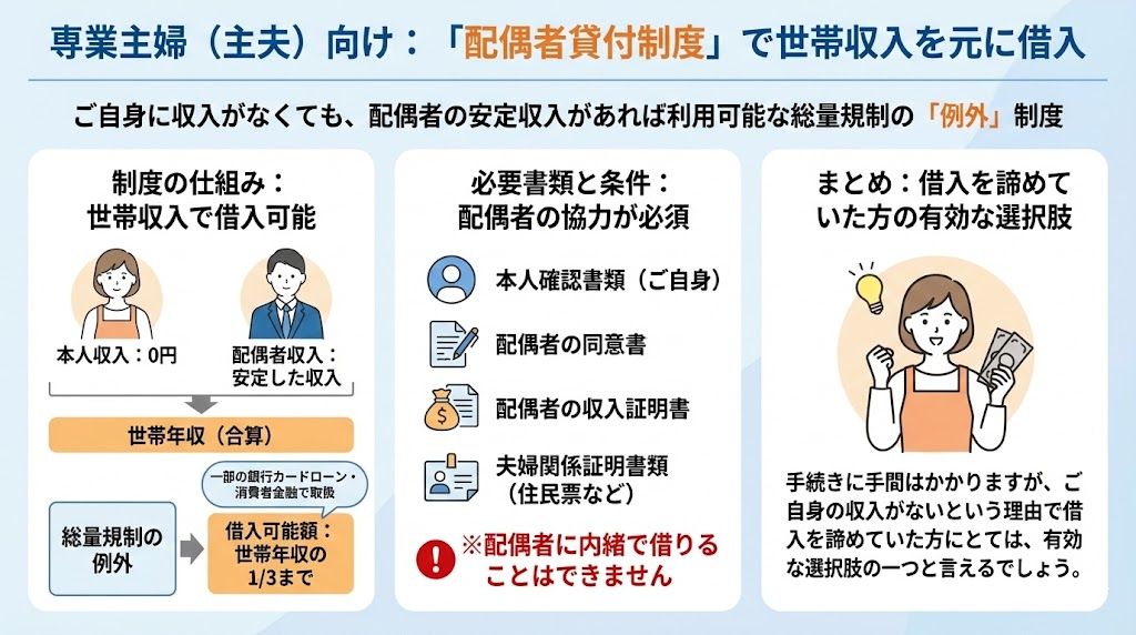 この制度を利用するためには、ご自身の本人確認書類に加えて、配偶者の同意書や収入証明書、そして配偶者との関係を証明する書類(住民票など)の提出が必要です。つまり、配偶者に内緒で借りることはできません。手続きに手間はかかりますが、ご自身の収入がないという理由で借入を諦めていた方にとっては、有効な選択肢の一つと言えるでしょう。