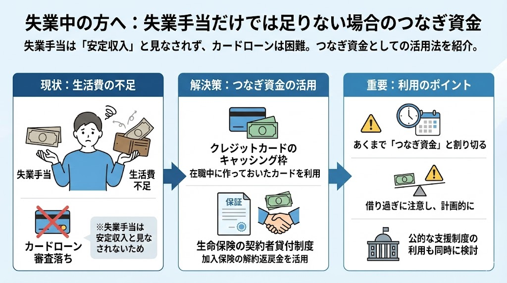 残念ながら、失業手当自体は「安定した収入」とは見なされないため、これを元にカードローンを組むことは困難です。しかし、このような状況でこそ、これまで紹介してきた方法が「つなぎ資金」として役立ちます。