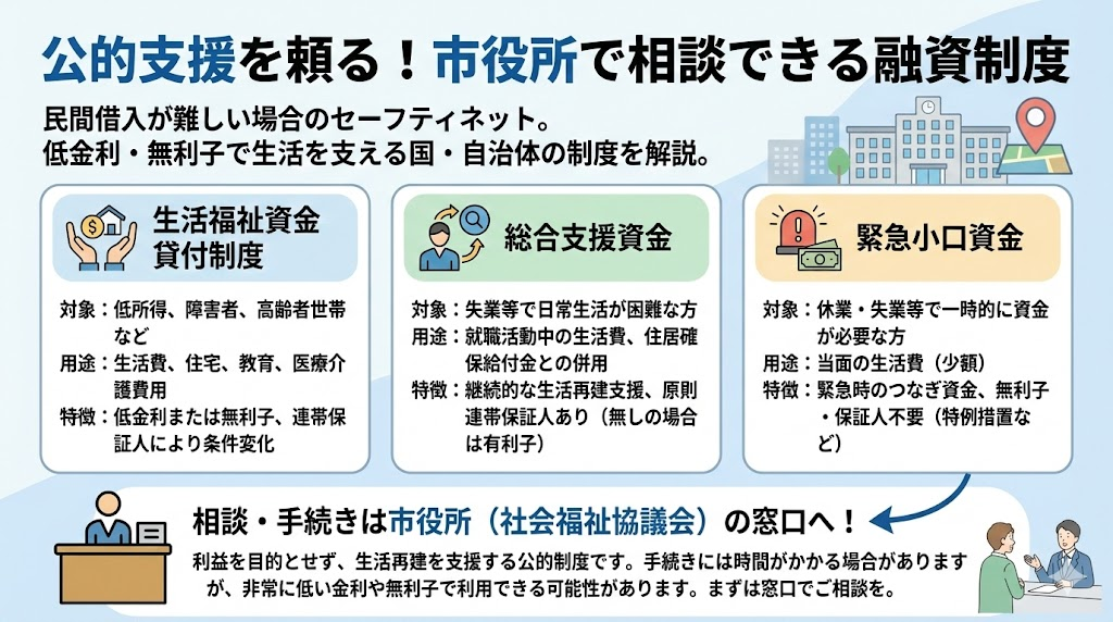 民間の金融サービスからの借入が難しい場合、次に目を向けるべきは国や自治体が提供する公的な支援制度です。これらの制度は、利益を目的とせず、生活に困窮している人々を支えるセーフティネットとして機能しています。手続きに時間はかかりますが、非常に低い金利、あるいは無利子で融資を受けられる可能性があるのが大きな魅力です。ここでは、市役所などで相談できる公的な融資制度について詳しく解説します。