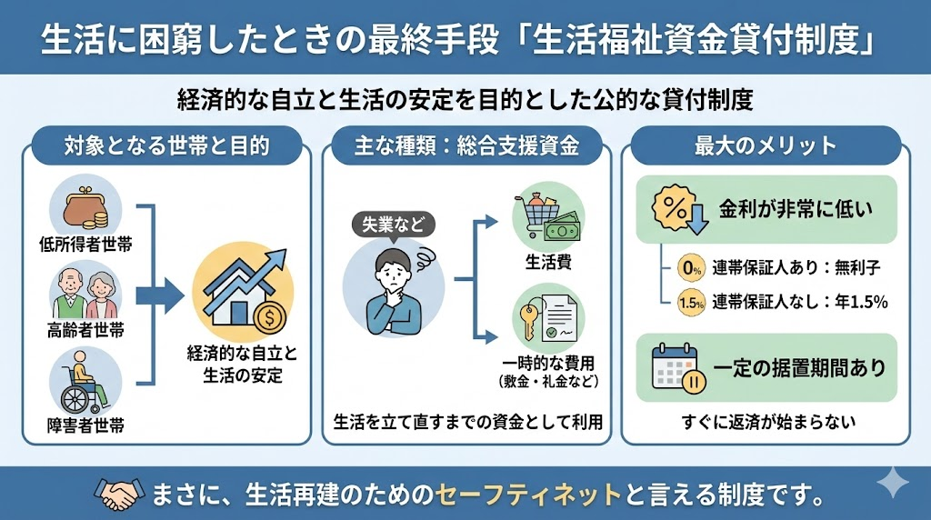 最大のメリットは、金利が非常に低いこと(連帯保証人ありなら無利子、なしでも年1.5%)です。また、すぐに返済が始まるのではなく、一定の据置期間が設けられています。まさに、生活再建のためのセーフティネットと言える制度です。