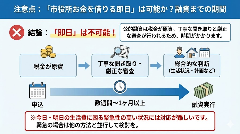 公的融資制度を検討する上で、最も注意すべき点はスピード感です。結論から言うと、「市役所お金を借りる即日」というのは不可能です。