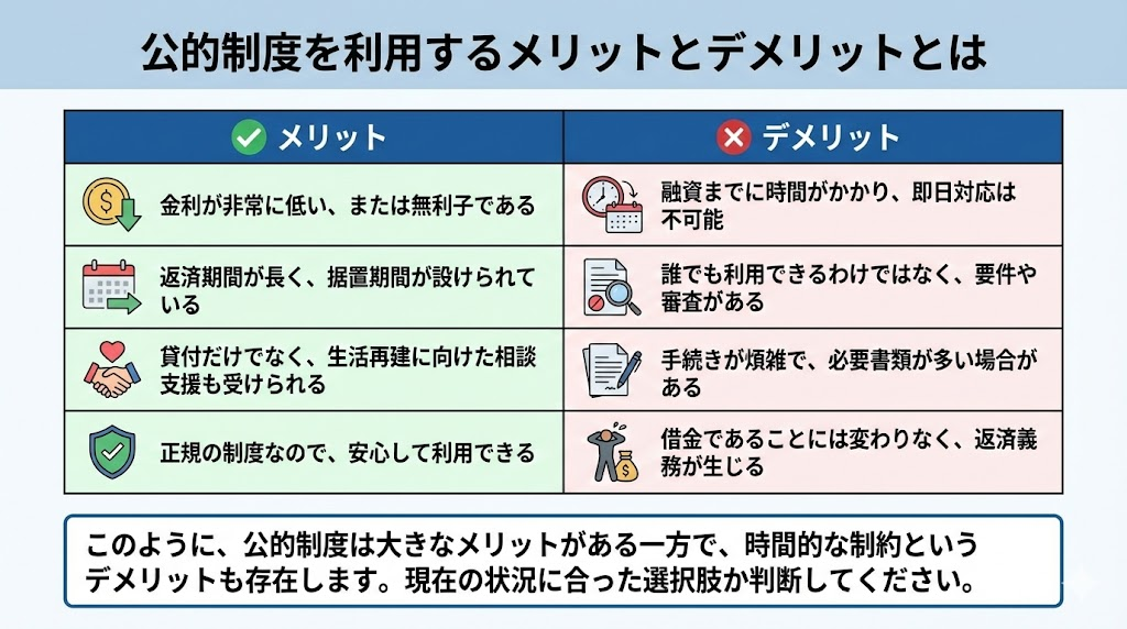 ここまで解説してきた公的融資制度について、メリットとデメリットをまとめます。これを理解した上で、自分に合った選択肢かどうかを判断してください。