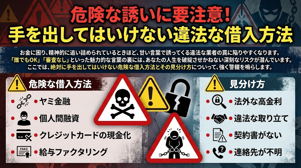お金に困り、精神的に追い詰められているときほど、甘い言葉で誘ってくる違法な業者の罠に陥りやすくなります。「誰でもOK」「審査なし」といった魅力的な言葉の裏には、あなたの人生を破綻させかねない深刻なリスクが潜んでいます。ここでは、絶対に手を出してはいけない危険な借入方法とその見分け方について、強く警鐘を鳴らします。