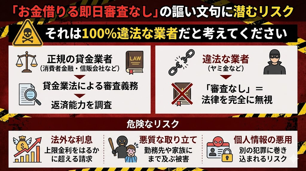 なぜならば、消費者金融や信販会社などの正規の貸金業者は、貸金業法という法律によって、申込者の返済能力を調査する「審査」が義務付けられているからです。審査をしないということは、法律を完全に無視している証拠に他なりません。