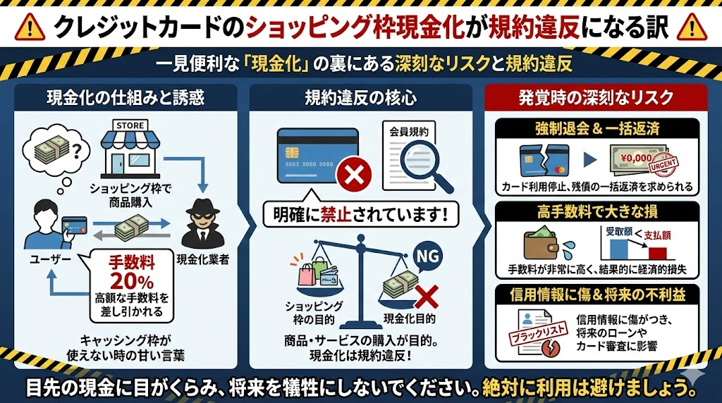一見すると便利に思えるかもしれませんが、この行為は多くのクレジットカード会社の会員規約で明確に禁止されています。ショッピング枠はあくまで商品やサービスの購入のために設定されたものであり、それを現金化目的で利用することは規約違反にあたるのです。