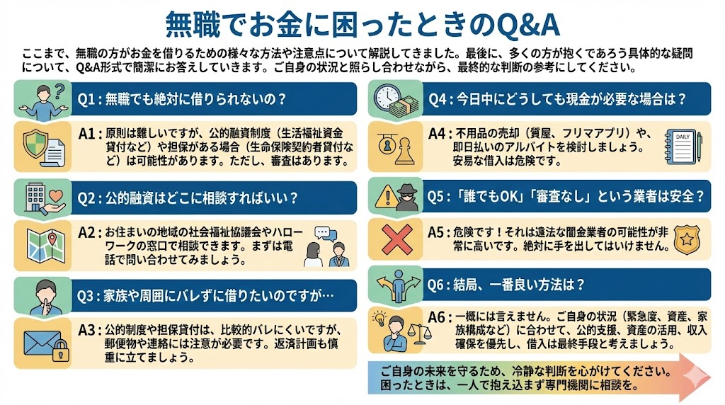 ここまで、無職の方がお金を借りるための様々な方法や注意点について解説してきました。最後に、多くの方が抱くであろう具体的な疑問について、Q&A形式で簡潔にお答えしていきます。ご自身の状況と照らし合わせながら、最終的な判断の参考にしてください。