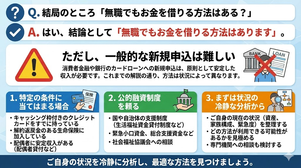 はい、結論として「無職でもお金を借りる方法はあります」。
