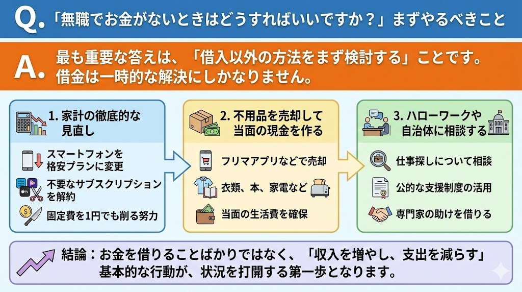 「無職でお金がないときはどうすればいいですか?」という問いに対して最も重要な答えは、「借入以外の方法をまず検討する」ことです。借金は一時的な解決にしかならず、根本的な問題解決にはなりません。