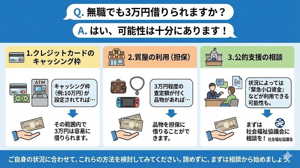 また、質屋を利用する場合、3万円程度の査定額が付く品物(例えば、ある程度のブランドの財布やアクセサリー、ゲーム機など)があれば、それを担保に借りることができます。さらに、状況によっては公的支援である「緊急小口資金」などが利用できる可能性もありますので、まずは社会福祉協議会に相談してみることをお勧めします。