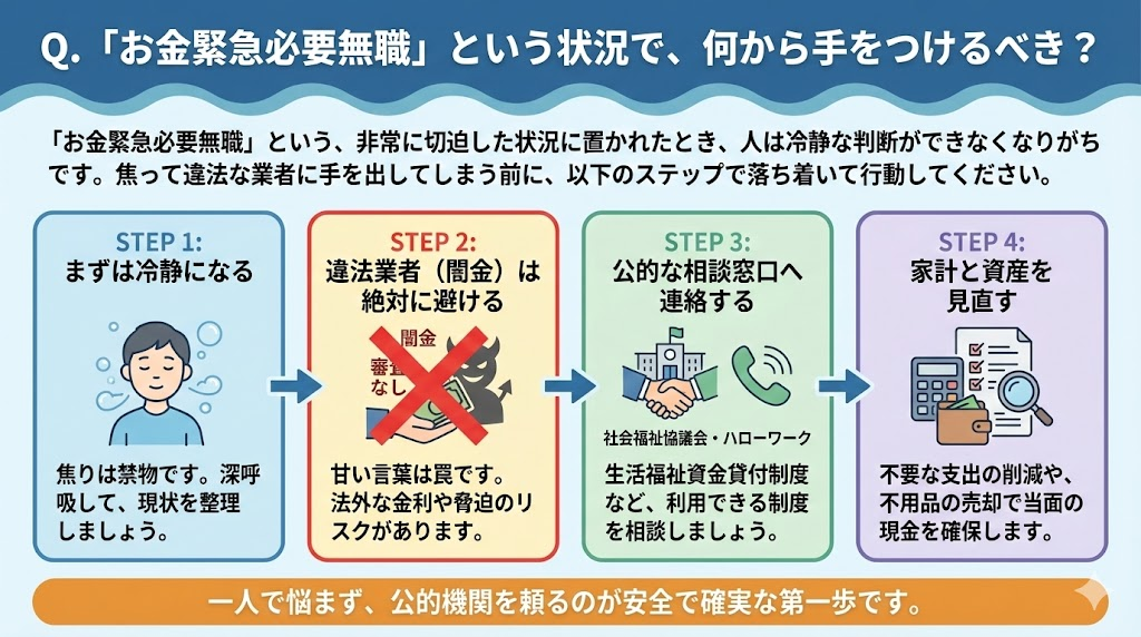 「お金緊急必要無職」という、非常に切迫した状況に置かれたとき、人は冷静な判断ができなくなりがちです。焦って違法な業者に手を出してしまう前に、以下のステップで落ち着いて行動してください。