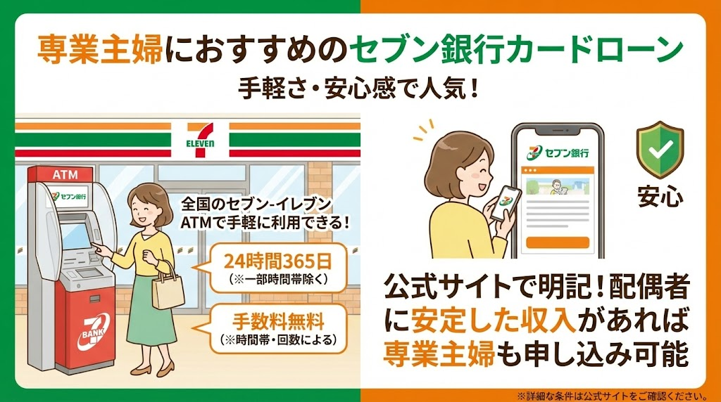 全国のセブン-イレブンにあるATMを手軽に利用できるセブン銀行カードローンは、専業主婦の方にとって非常に利便性が高く、人気の選択肢の一つです。