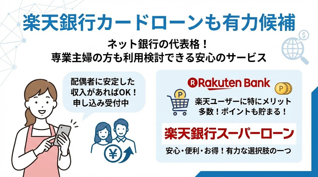 ネット銀行の代表格である楽天銀行スーパーローンも、専業主婦の方が利用を検討できる有力なカードローンの一つです。
