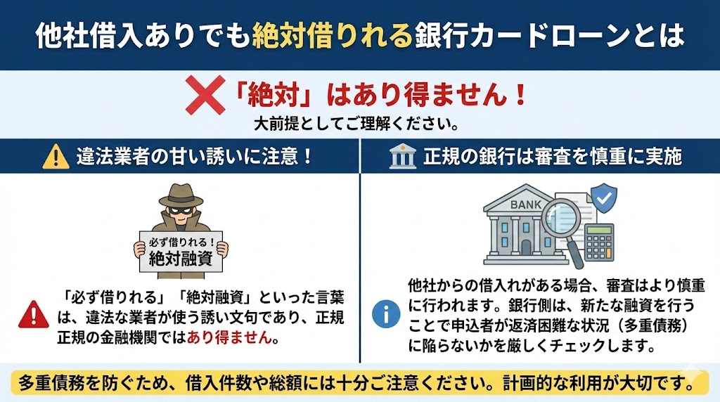 まず、大前提としてご理解いただきたいのは、「他社借入ありでも“絶対”借りれる銀行カードローン」というものは存在しないということです。