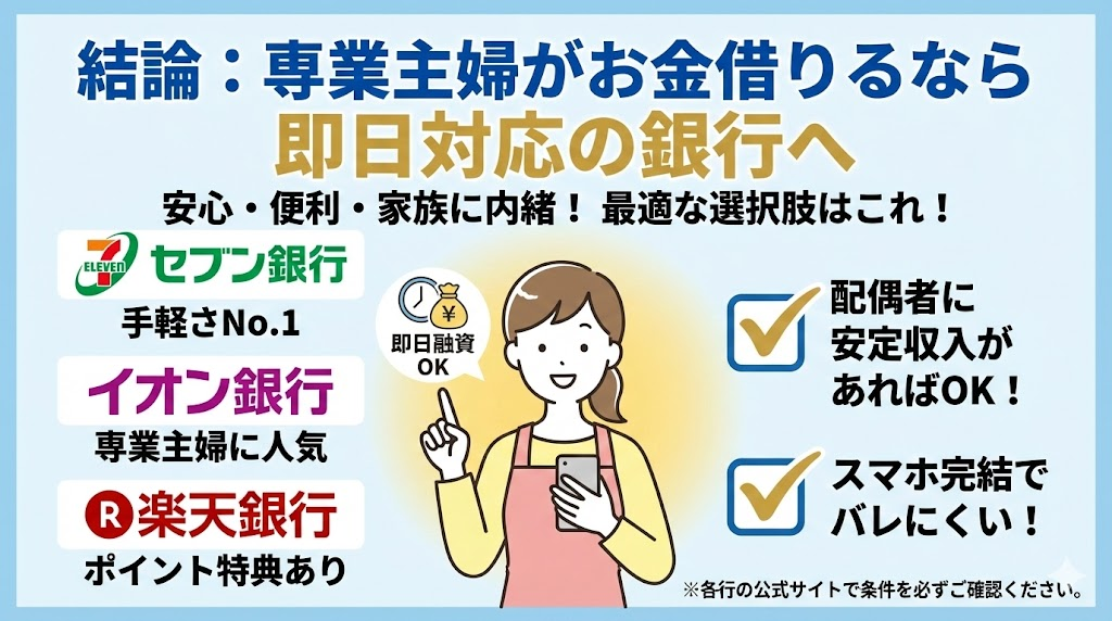 結論:専業主婦がお金借りるなら即日対応の銀行へ