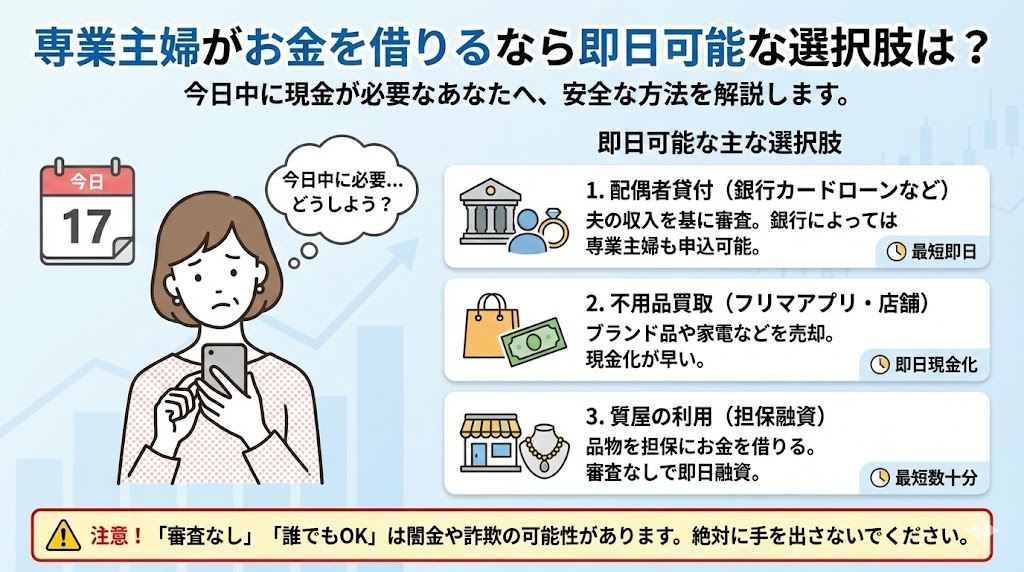 収入のない専業主婦が「どうしても今日中にお金が必要…」という状況に置かれたとき、どのような選択肢があるのでしょうか。