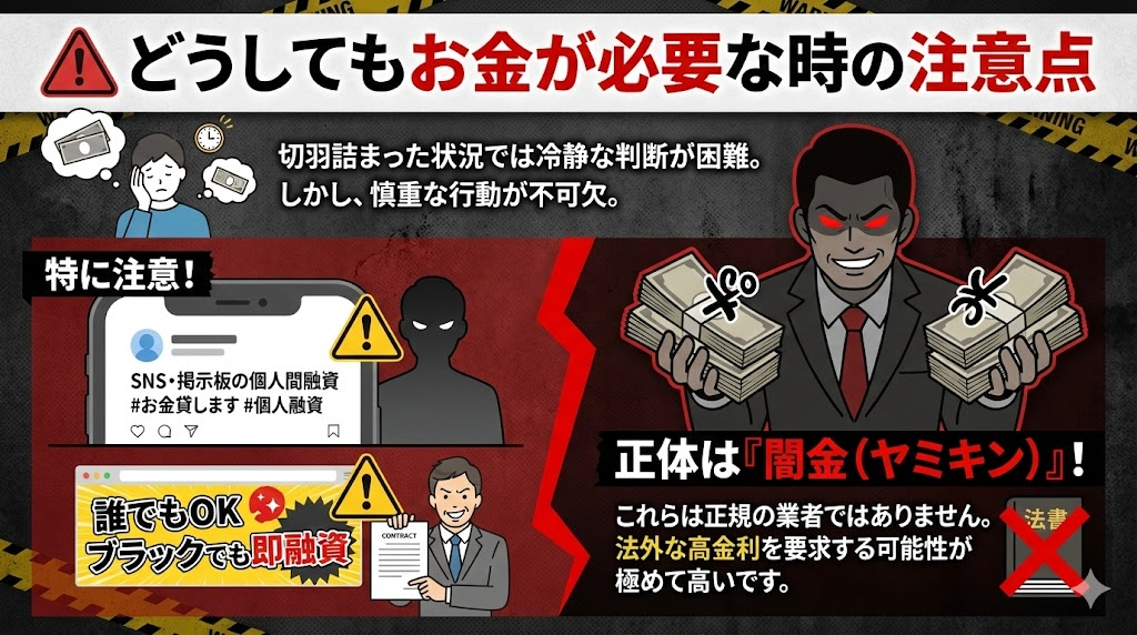 「どうしてもお金が必要」という切羽詰まった状況では、冷静な判断が難しくなりがちです。しかし、そんな時こそ慎重に行動しなければ、さらに深刻なトラブルに巻き込まれる可能性があります。