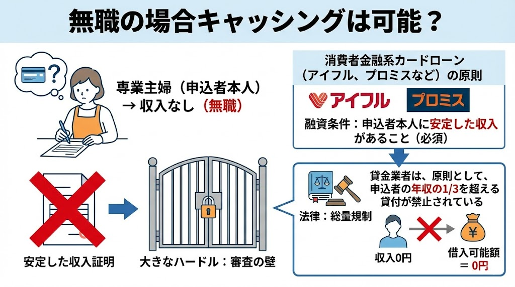 特に、アイフルやプロミスといった消費者金融系のカードローンは、原則として「申込者本人に安定した収入があること」を融資の条件としています。これは、「総量規制」という法律が関係しています。