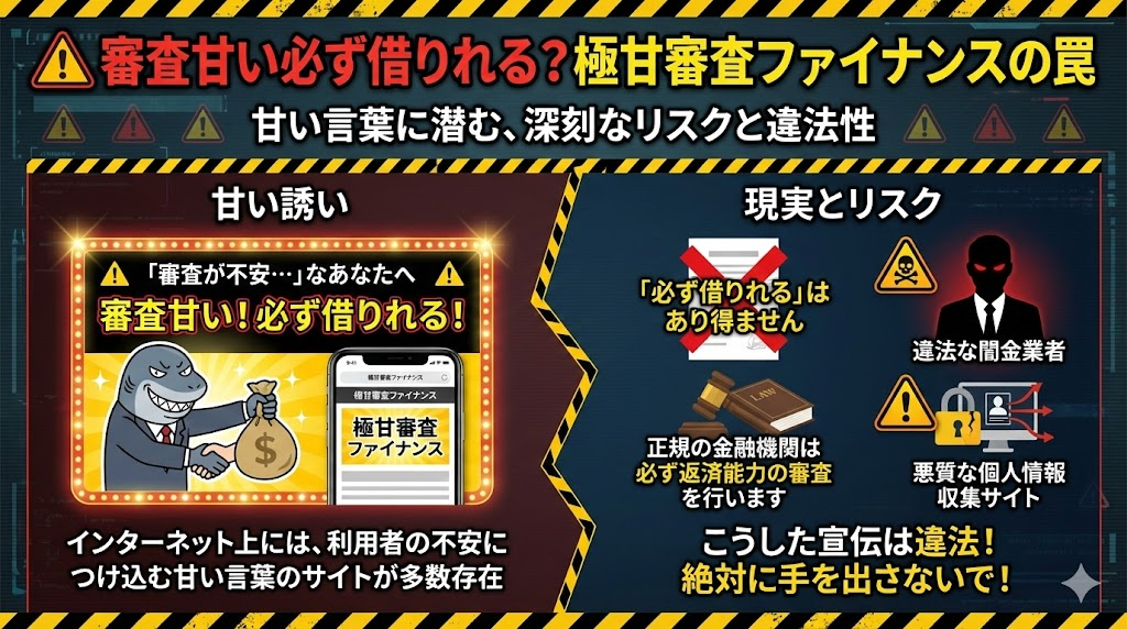 インターネット上には「審査甘い必ず借りれる」「借入 極甘審査ファイナンス」といった魅力的な言葉が並びますが、これらには大きなリスクが伴います。